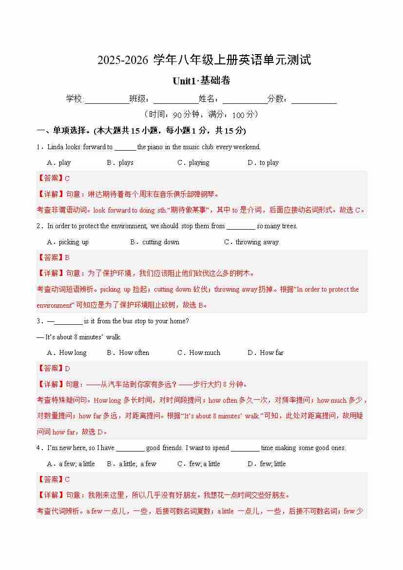 首页 > 全部 > 单元基础卷 > 八年级英语上册Unit1单元测试·基础卷(解析版)
