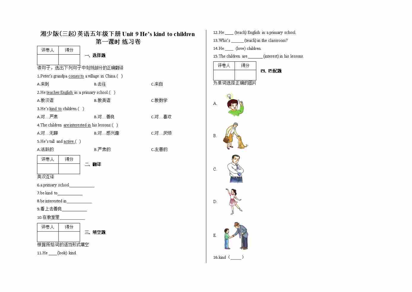 五年级下册Unit 9 He’s kind to children 第一课时 练习卷及答案-湘少版(三起)英语