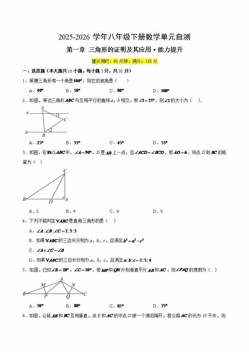 八下数学第一章 三角形的证明及其应用·提升卷(试题版A4)