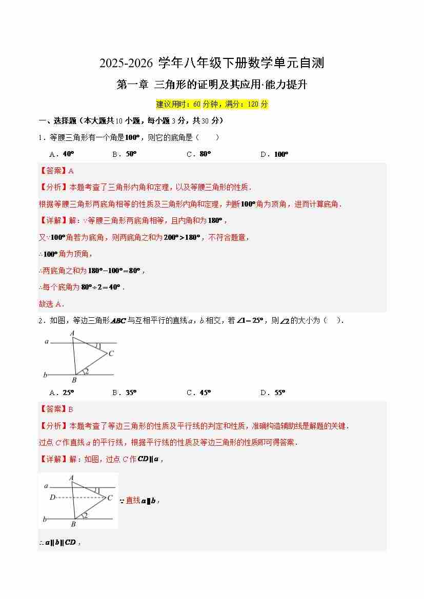 首页 > 全部 > 单元测试 > 八下数学第一章 三角形的证明及其应用·提升卷(解析版)