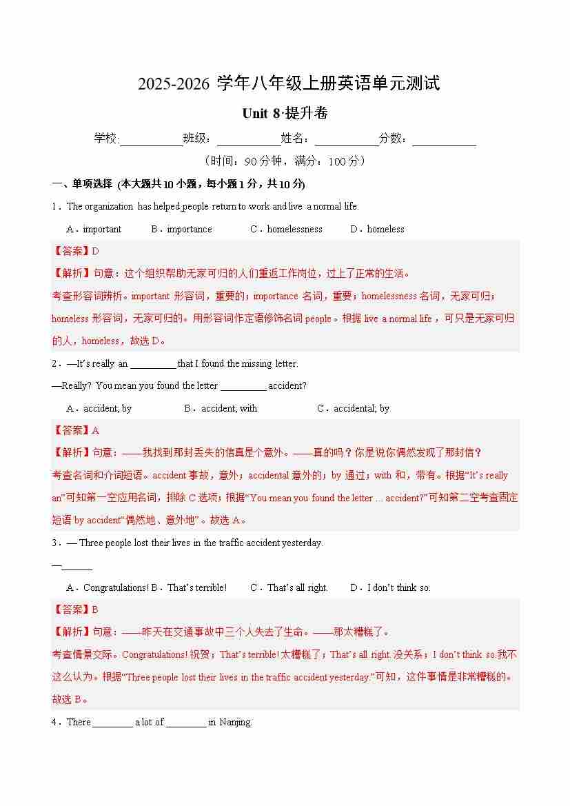 首页 > 全部 > 单元测试卷 > Unit 8 单元测试·提升卷(解析版)