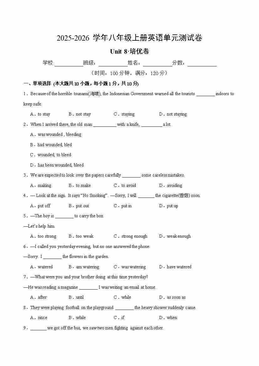 首页 > 全部 > 单元测试卷 > Unit 8 单元测试·培优卷(考试版A4)