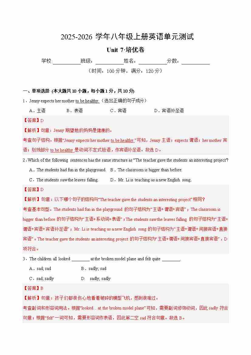 Unit 7 单元测试·培优卷(解析版)