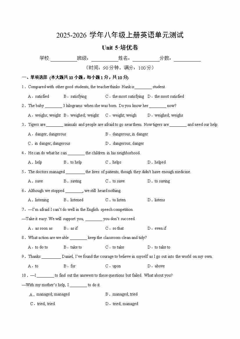 首页 > 全部 > 单元测试卷 > Unit 5 单元测试·培优卷(考试版A4)
