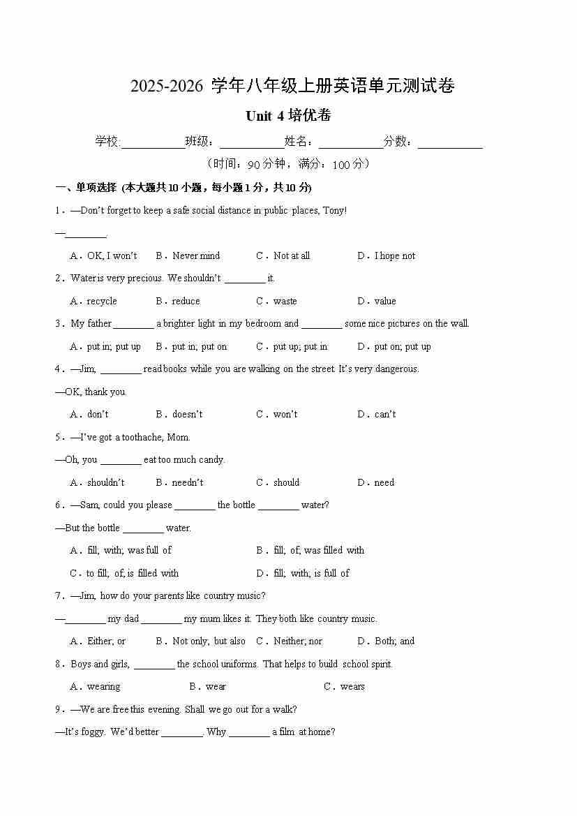 首页 > 全部 > 单元测试卷 > Unit 4 单元测试·培优卷(考试版A4)