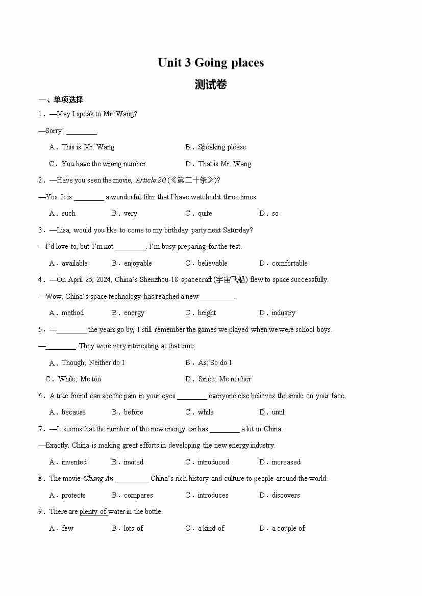 首页 > 全部 > 单元测试 > 09. Unit 3 Going places(单元卷·测试卷)(学生版)