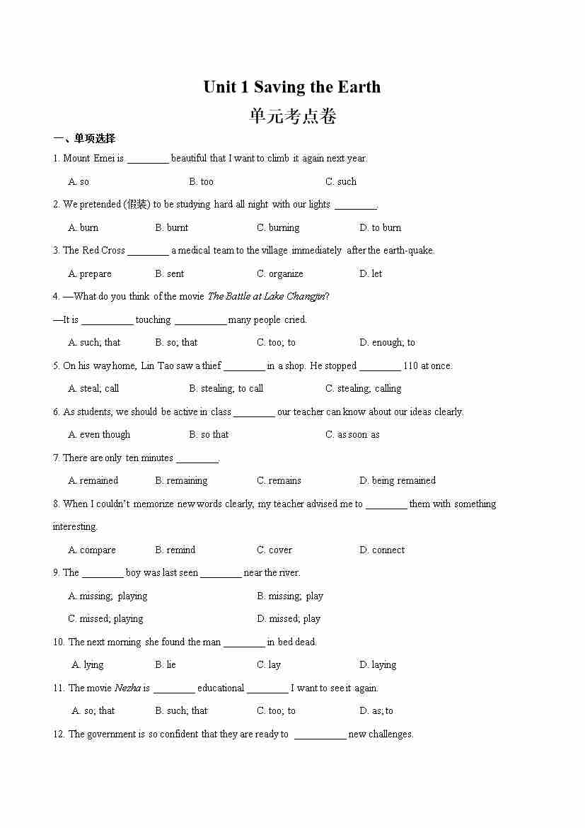 首页 > 全部 > 单元测试 > 02. Unit 1 Saving the Earth(单元卷·考点卷)(学生版)