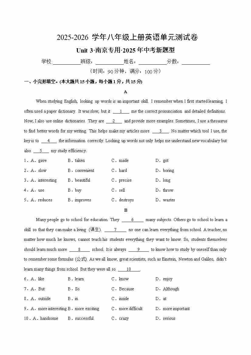 首页 > 全部 > 单元测试卷 > Unit 3 单元测试·南京专用·2025年中考新题型(考试版A4)