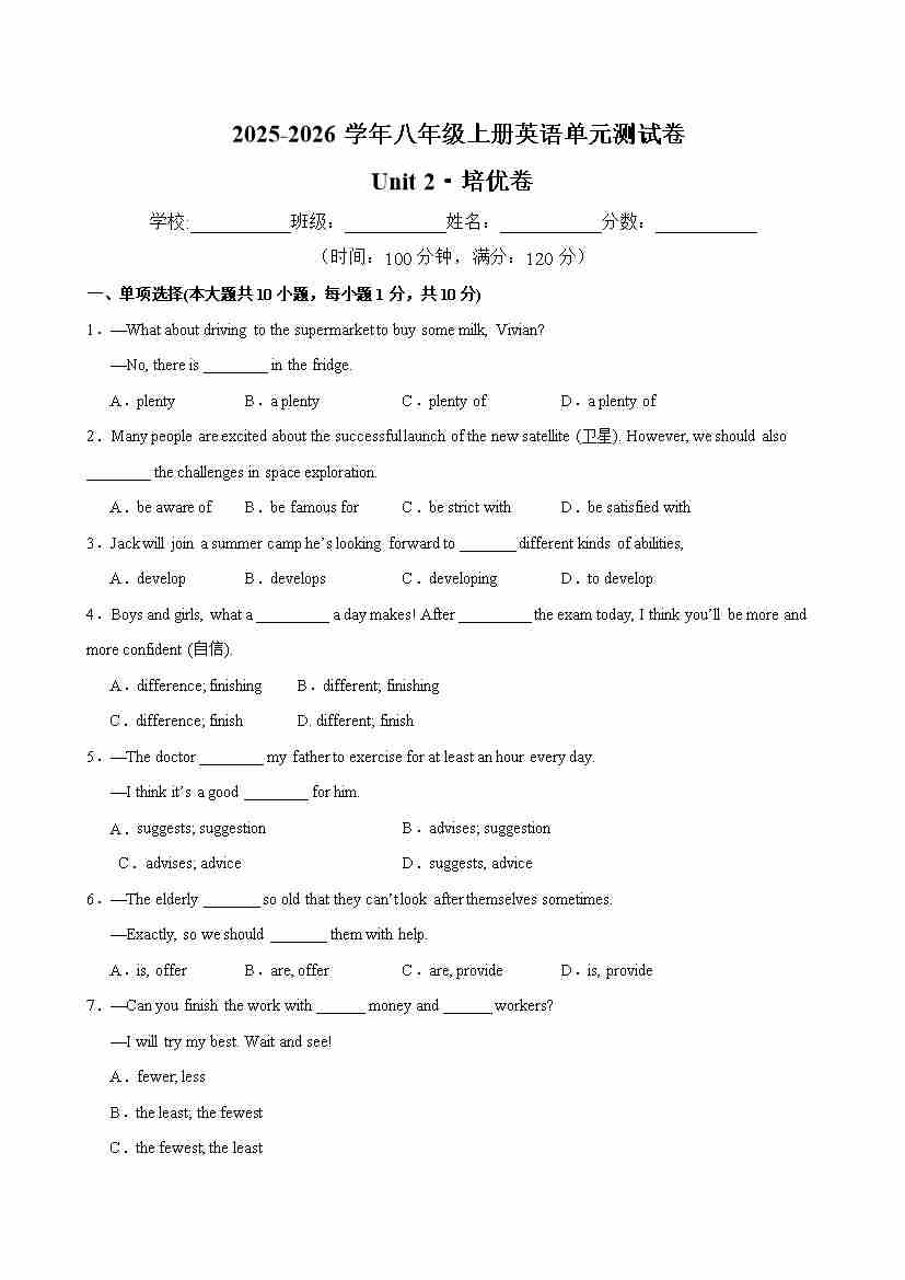 首页 > 全部 > 单元测试卷 > Unit 2 单元测试·培优卷(考试版A4)