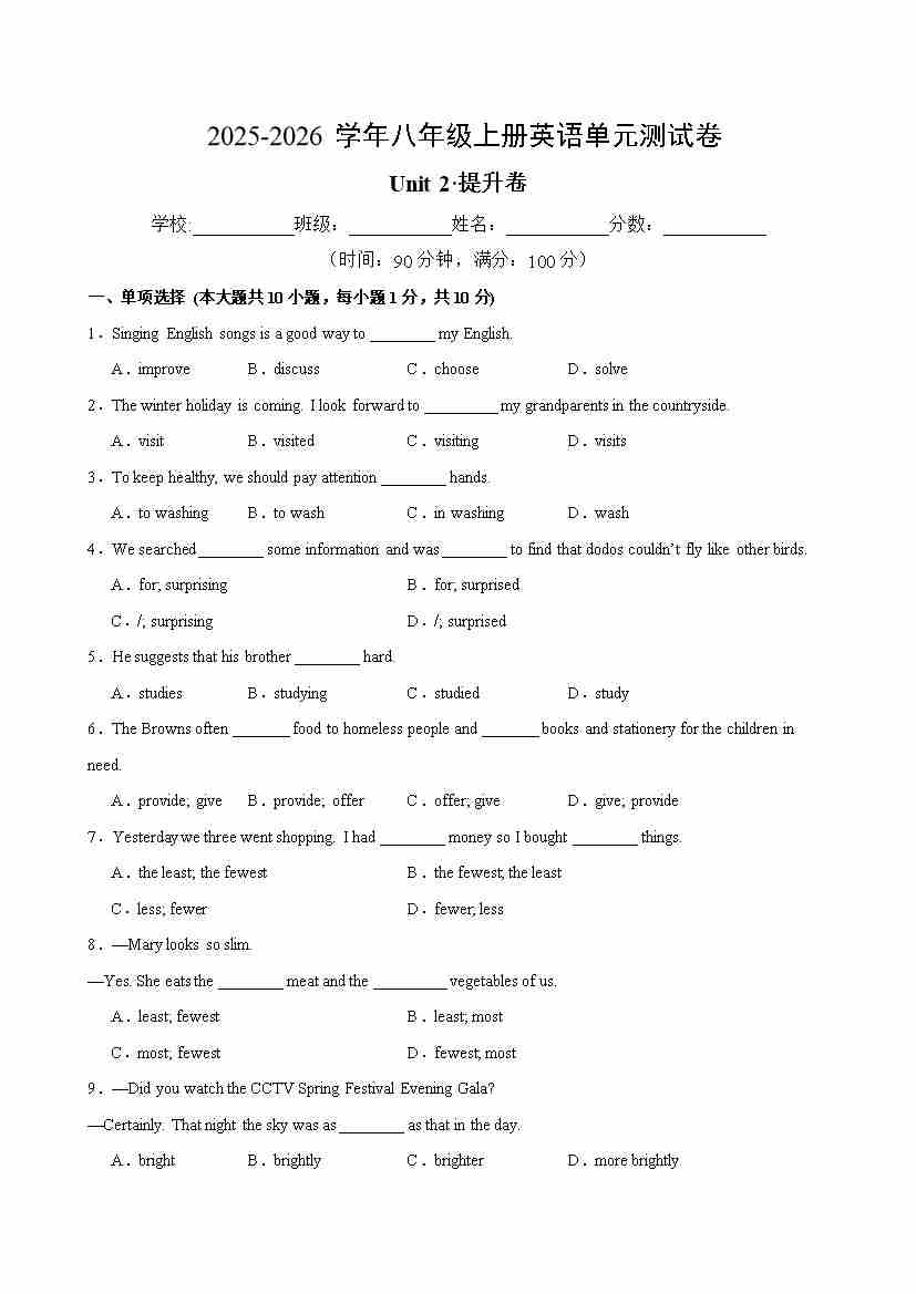 首页 > 全部 > 单元测试卷 > Unit 2 单元测试·提升卷(考试版A4)
