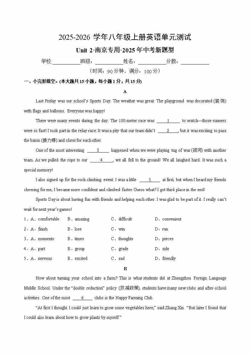 首页 > 全部 > 单元测试卷 > Unit 2 单元测试·南京专用·2025年中考新题型(考试版A4)