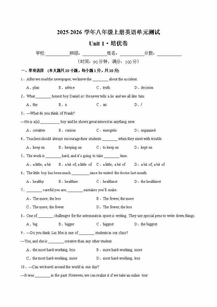 Unit 1 单元测试·培优卷(考试版A4)