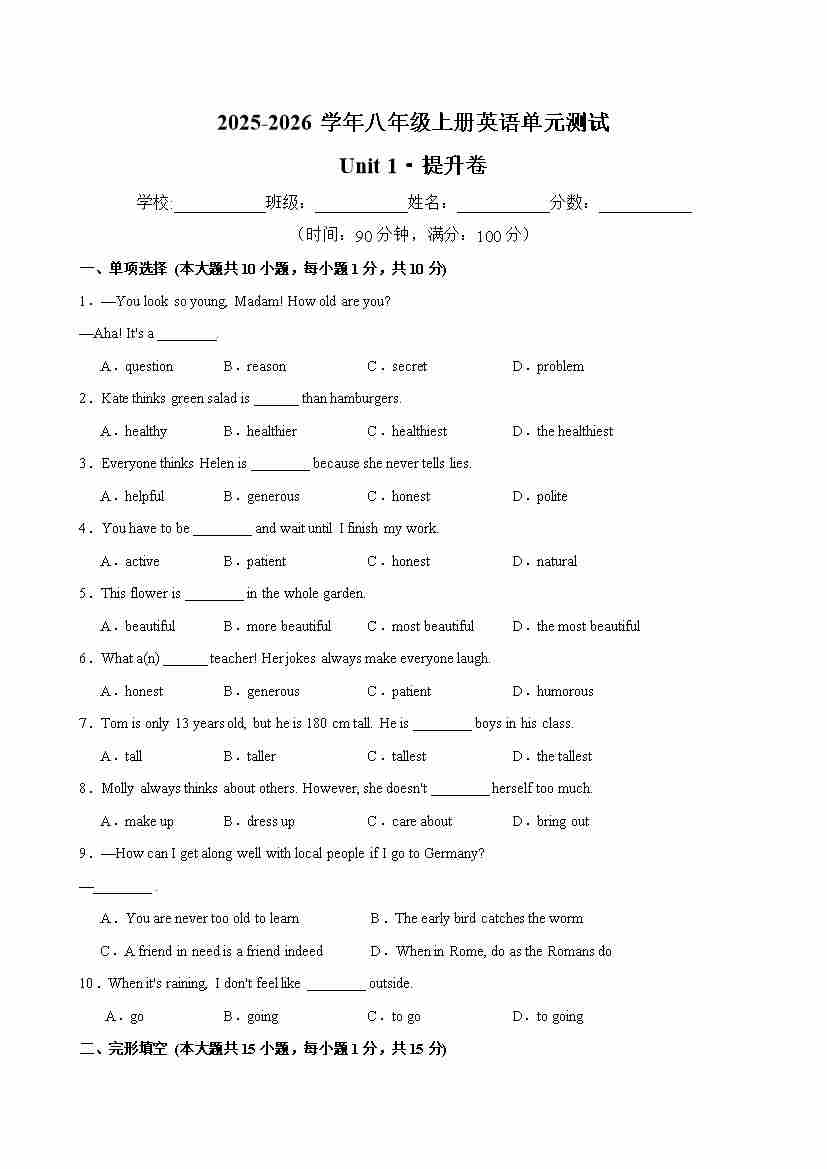 首页 > 全部 > 单元测试卷 > Unit 1 单元测试·提升卷(考试版A4)