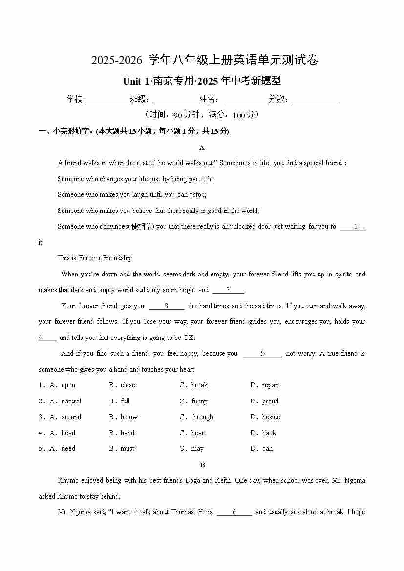 首页 > 全部 > 单元测试卷 > Unit 1 单元测试·南京专用·2025年中考新题型(考试版A4)