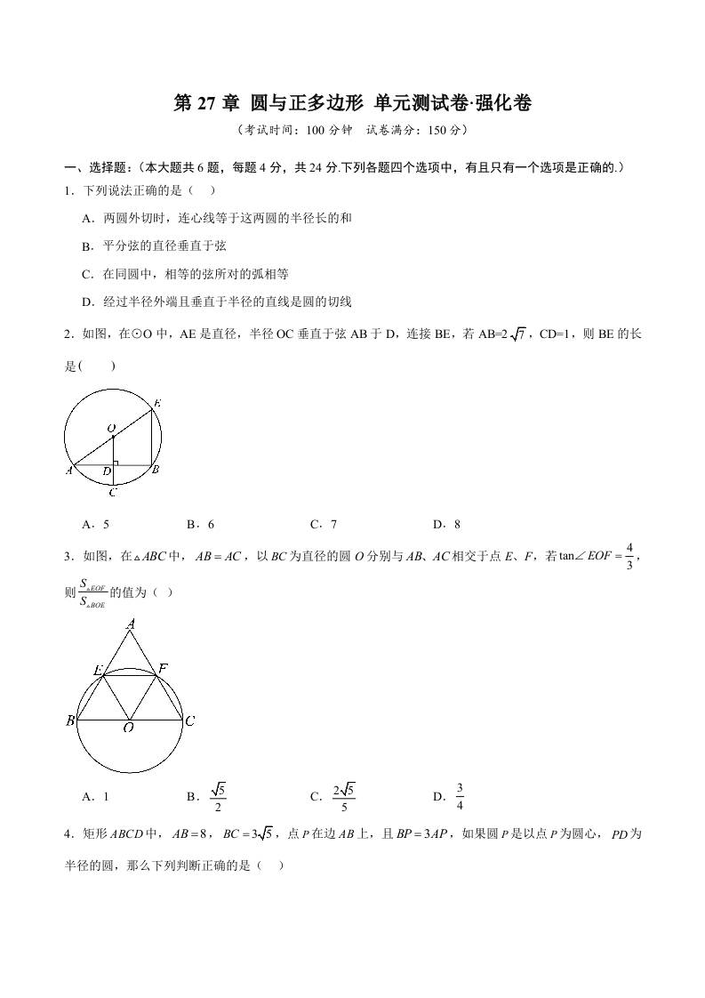 首页 > 全部 > 同步讲义 > 第27章 圆与正多边形 (高效培优单元测试·提升卷)(原卷版)
