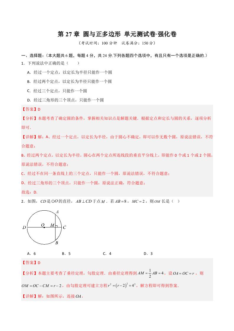 第27章 圆与正多边形(高效培优单元测试·强化卷)(解析版)