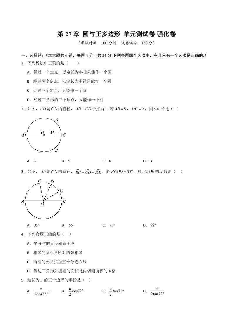 首页 > 全部 > 同步讲义 > 第27章 圆与正多边形(高效培优单元测试·强化卷)(原卷版)