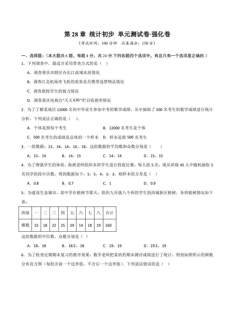 第28章 统计初步 (高效培优单元测试·强化卷)(原卷版)