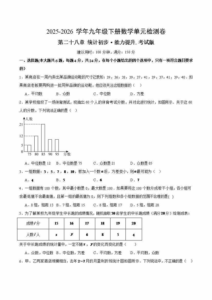 首页 > 全部 > 单元测试 > 第二十八章 统计初步(单元测试·提升卷)(考试版A4)