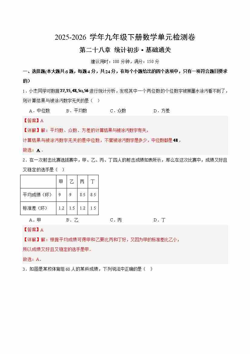 第二十八章 统计初步(单元测试·基础卷)(全解全析)