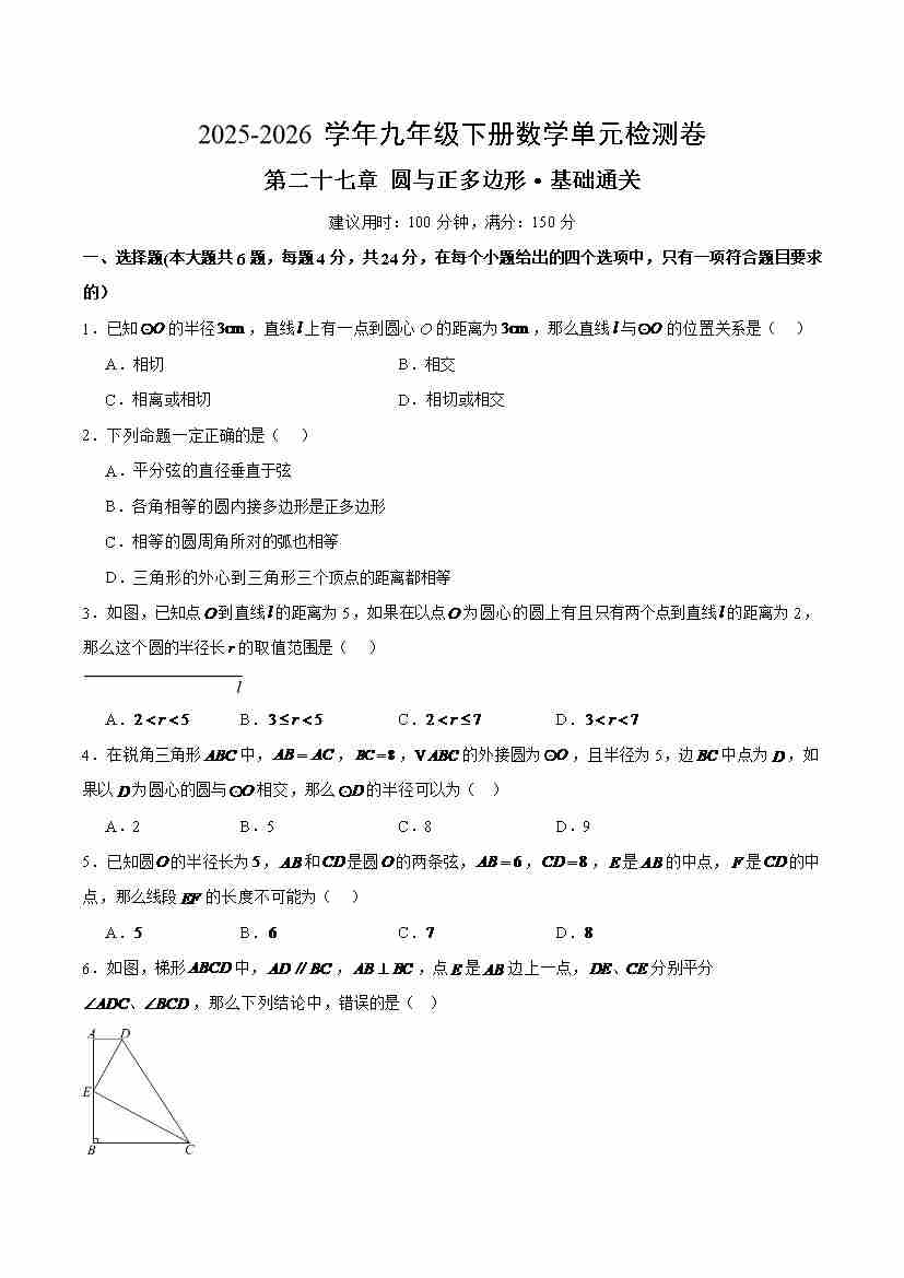 首页 > 全部 > 单元测试 > 第二十七章 圆与正多边形(单元测试·基础卷)(考试版A4)
