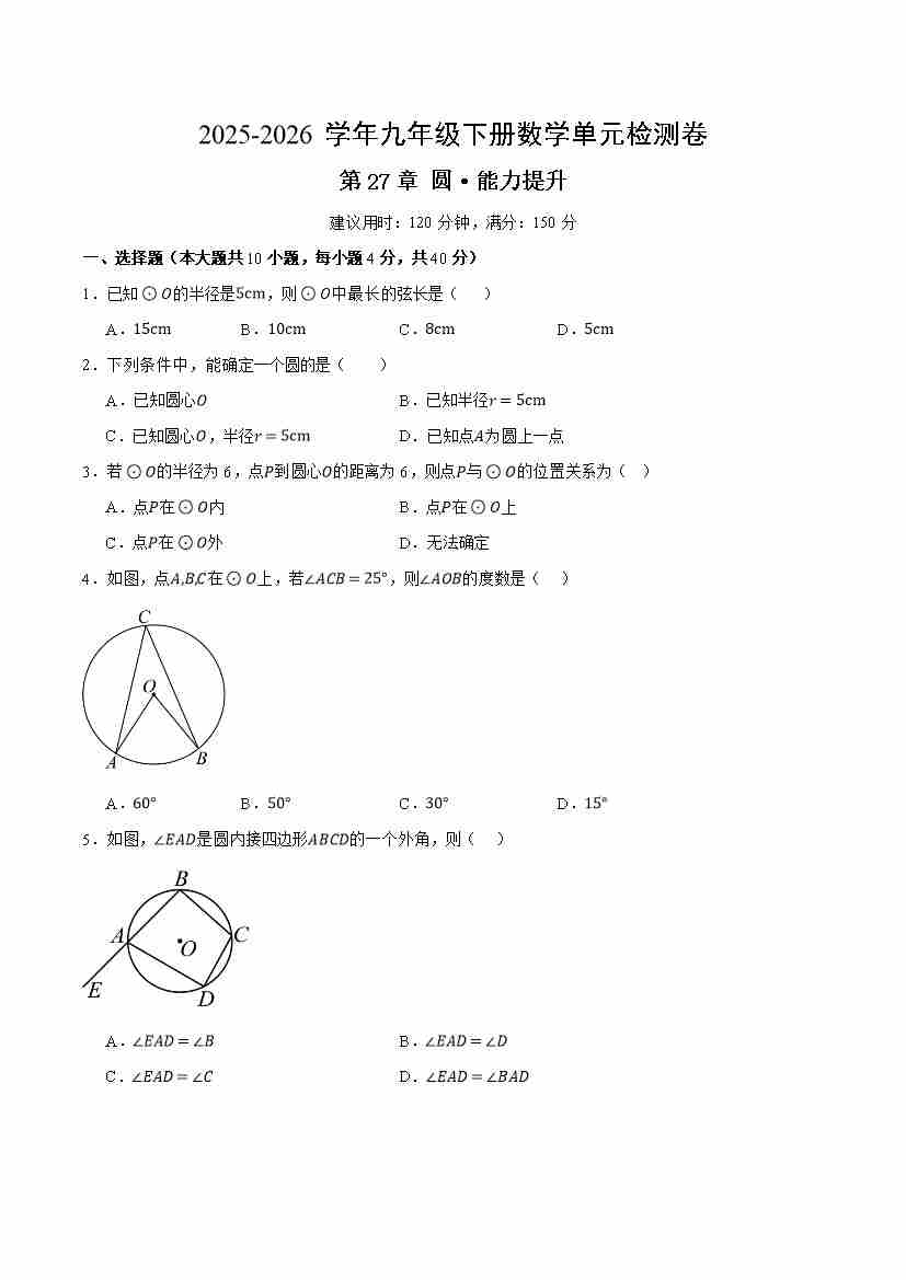 首页 > 全部 > 单元测试 > 九下数学第27章 圆 测试·提升卷(考试版A4)