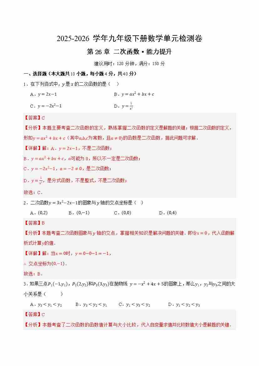 九下数学第26章 二次函数 测试·提升卷(解析版)