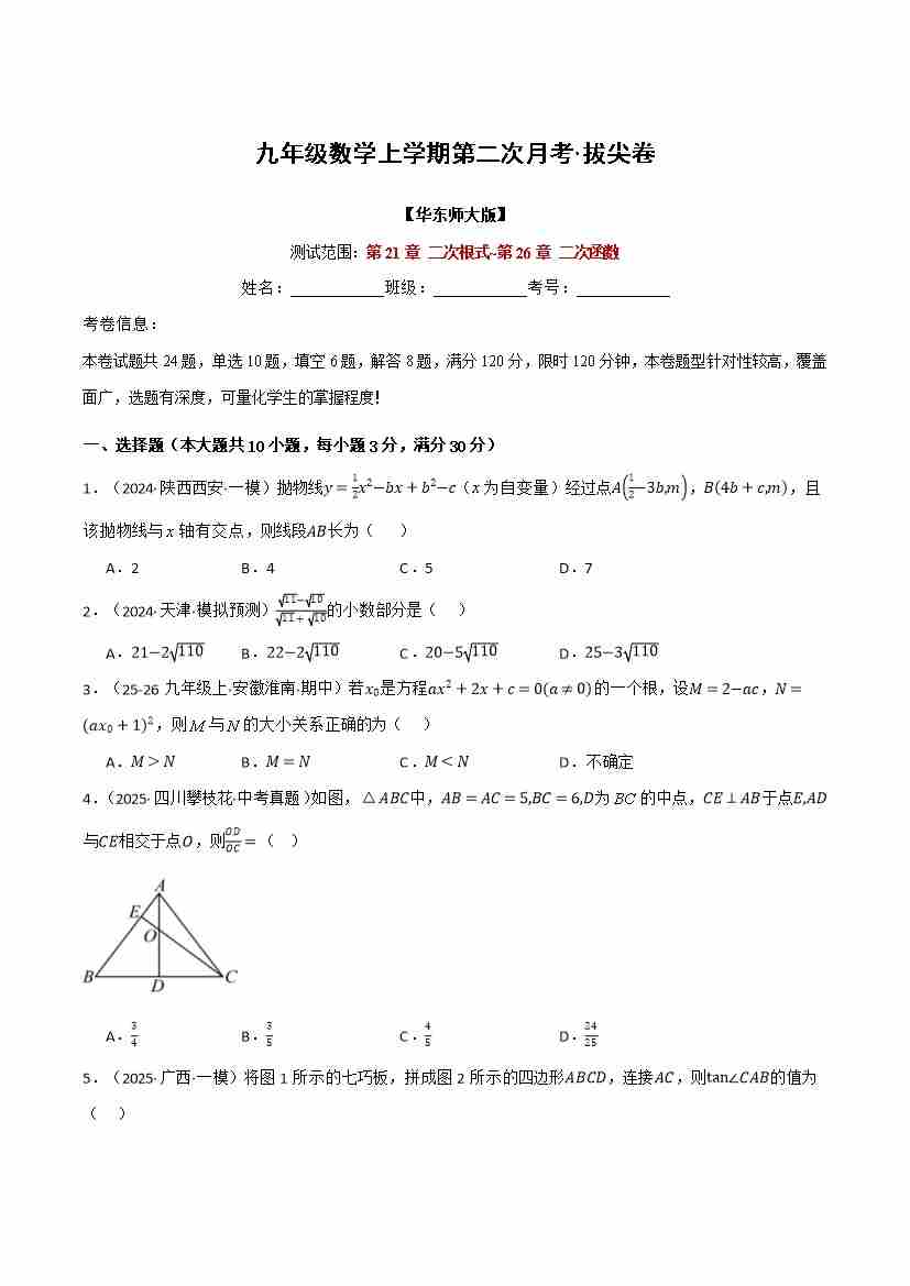 九年级数学上学期第二次月考·拔尖卷,举一反三,测试范围:第21章 二次根式~第26章 二次函数)(原卷版)