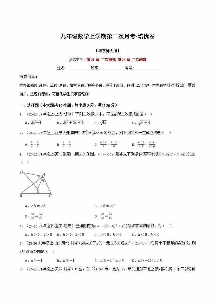 首页 > 全部 > 月考试卷 > 九年级数学上学期第二次月考·培优卷(华东师大版,举一反三,测试范围:第21章 二次根式~第26章 二次函数)(原卷版)