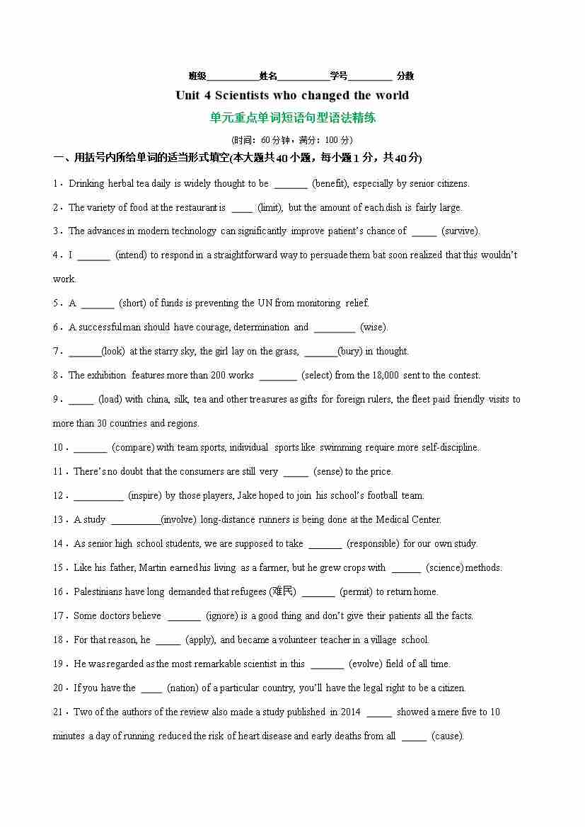 Unit 4 Scientists who changed the world (单元卷•考点卷)(单词短语句型语法)-(学生版)