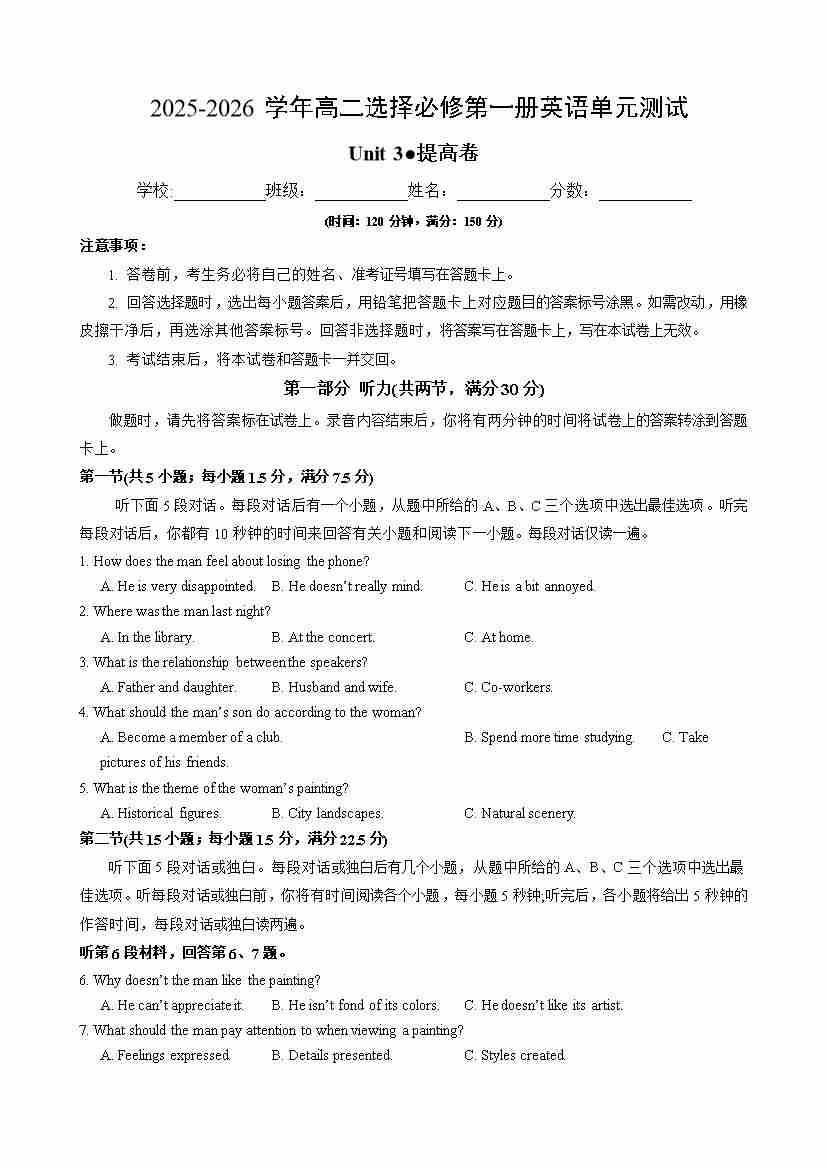 首页 > 全部 > 单元测试 > 高二英语选择必修第一册Unit 3 单元测试·提升卷(考试版A4)