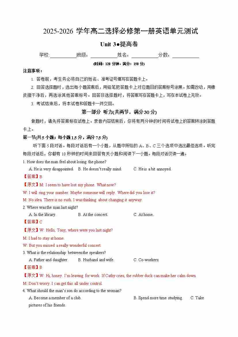 首页 > 全部 > 单元测试 > 高二英语选择必修第一册Unit 3 单元测试·提升卷(教师版)