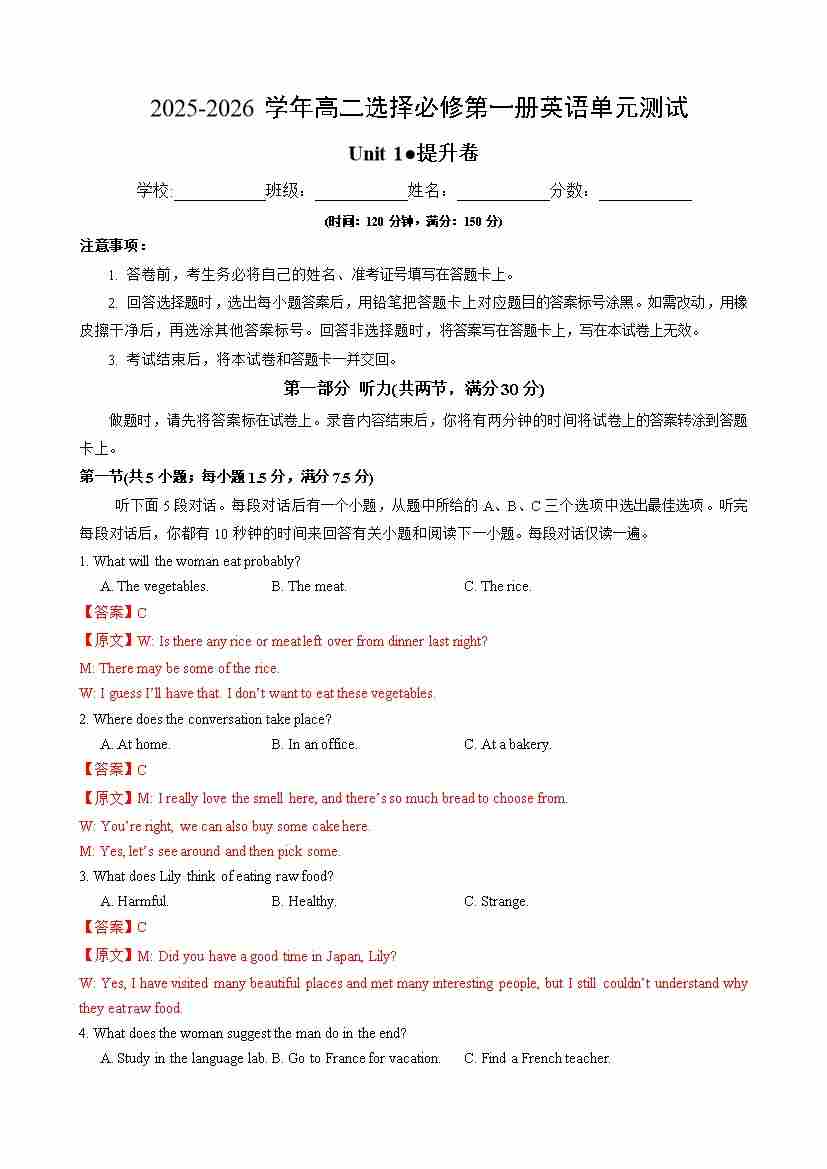 首页 > 全部 > 单元测试 > 高二英语选择必修第一册Unit 1 单元测试·提升卷(教师版)