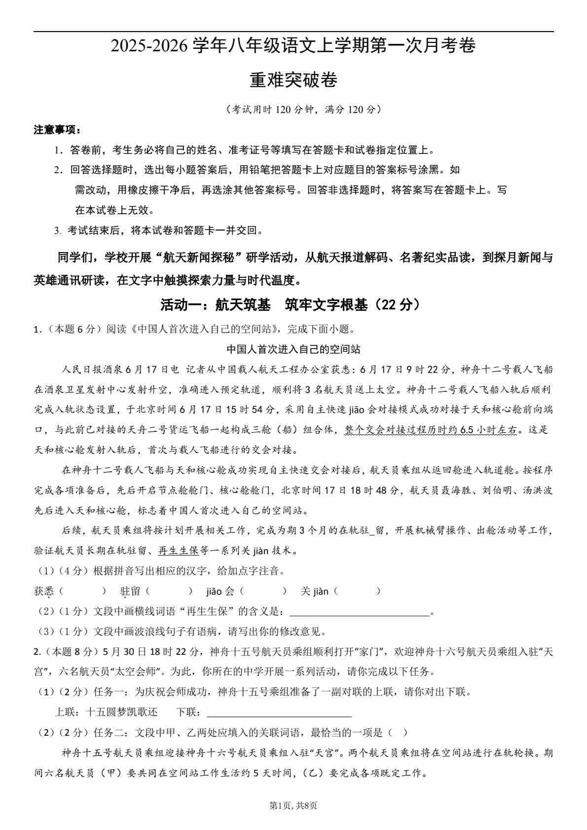 八年级语文第一次月考卷·重难突破卷(考试版A4)(统编版2024)