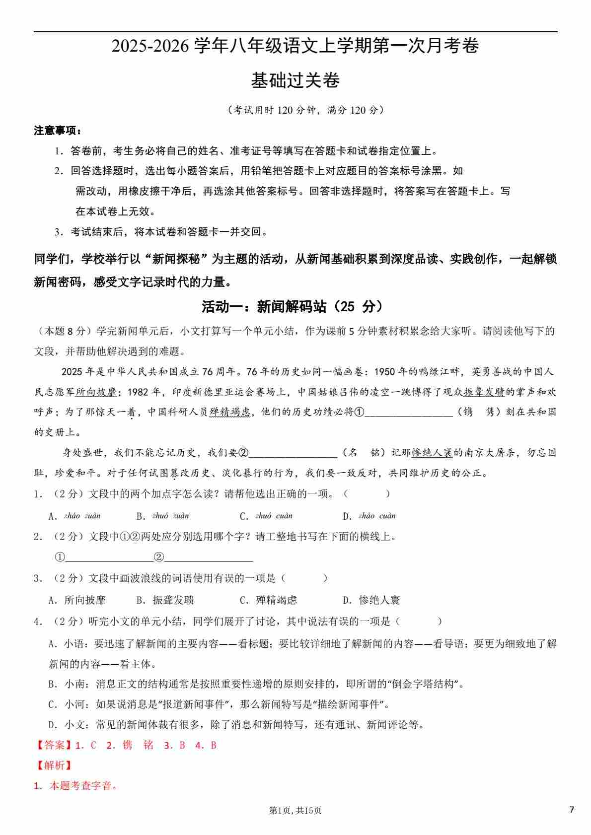 首页 > 全部 > 月考试卷 > 八年级语文第一次月考卷·基础过关卷(全解全析)(统编版2024)