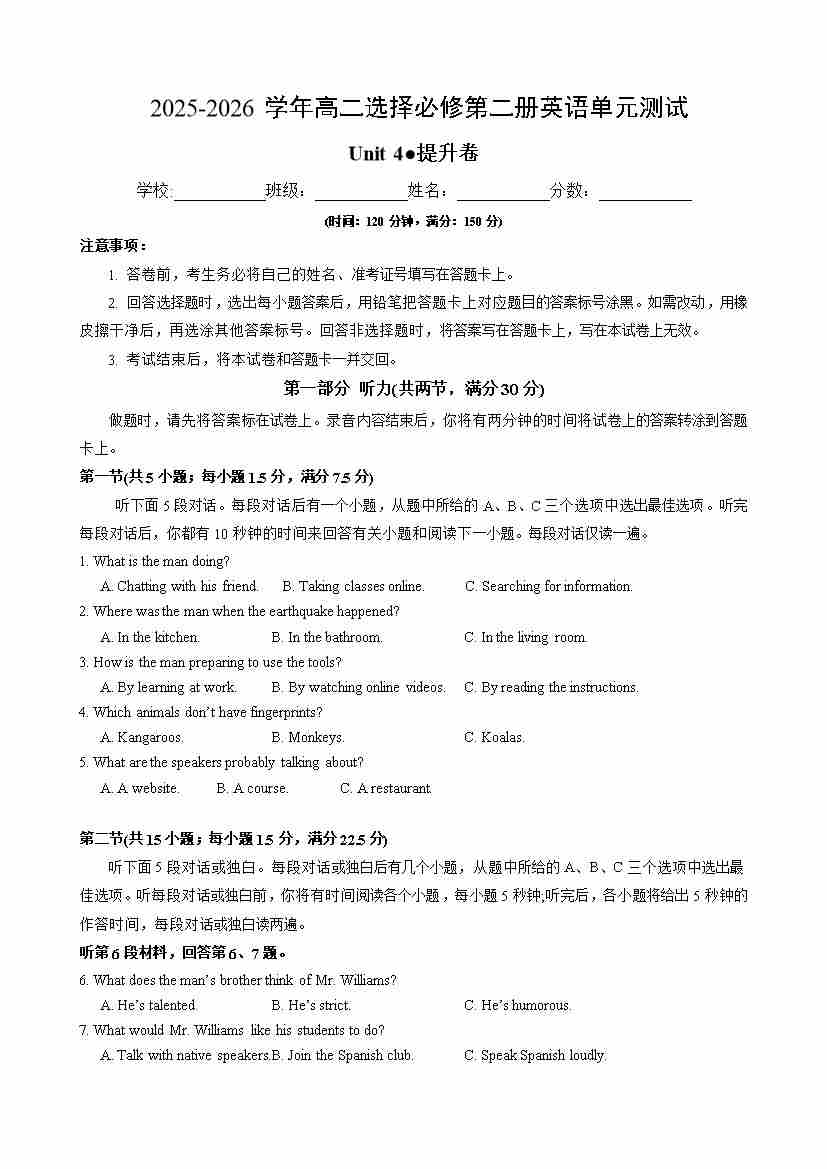 首页 > 全部 > 单元测试 > 高二英语选择必修第二册Unit 4 单元测试·提升卷(考试版A4)