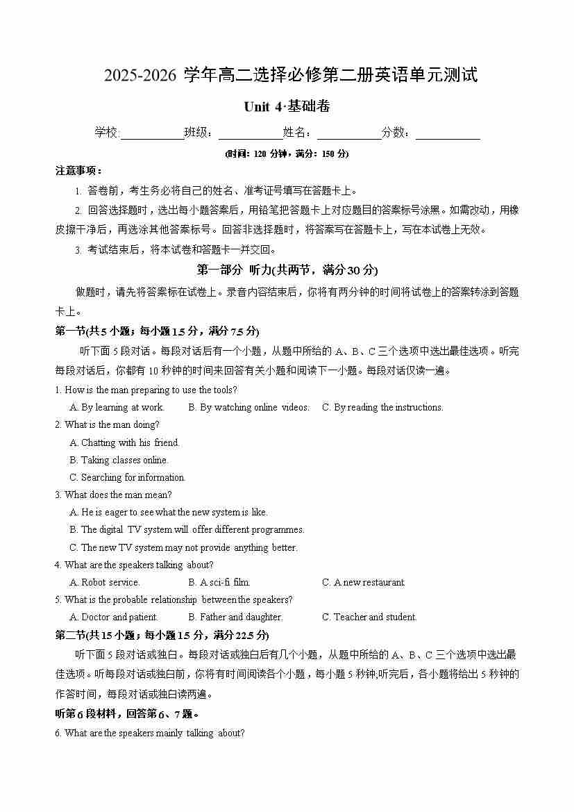 首页 > 全部 > 单元测试 > 高二英语选择必修第二册Unit 4 单元测试·基础卷(考试版A4)