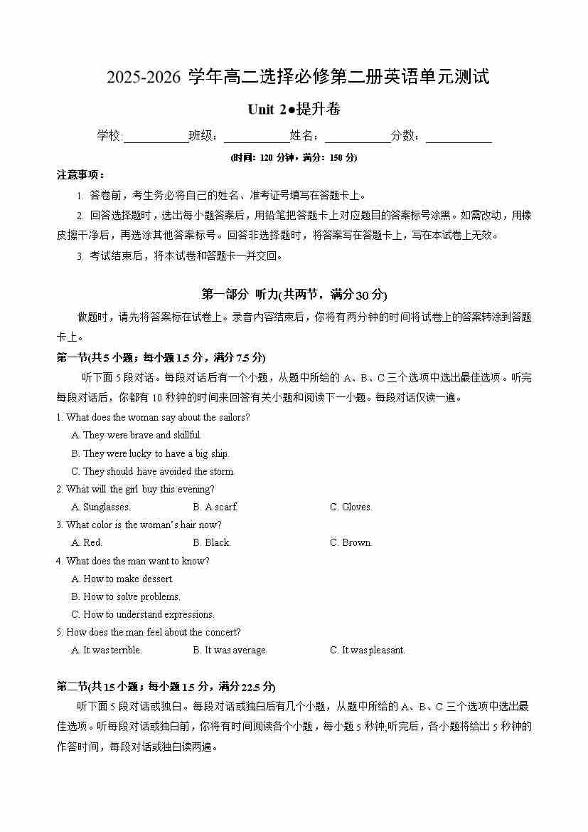 首页 > 全部 > 单元测试 > 高二英语选择必修第二册Unit 2 单元测试·提升卷(考试版A4)