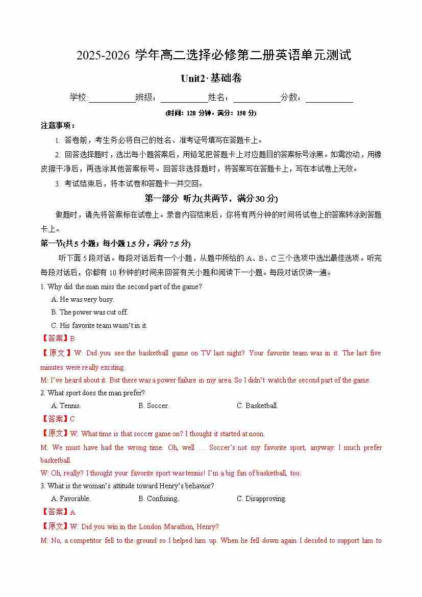 首页 > 全部 > 单元测试 > 高二英语选择必修第二册Unit 2 单元测试·基础卷(教师版)