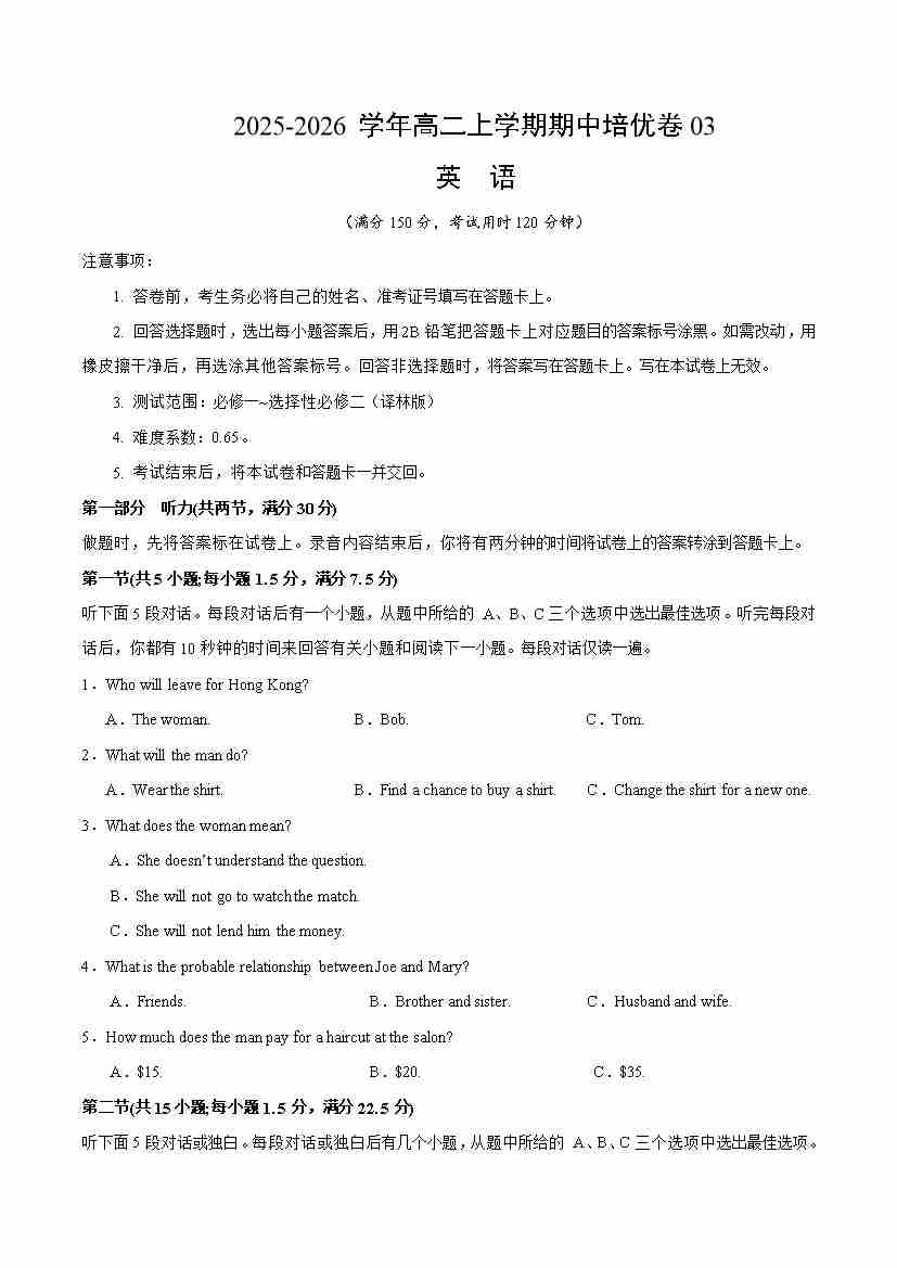 首页 > 全部 > 期中试卷 > 高二英语上学期期中考试卷(译林版·江苏专用)(考试版A4)