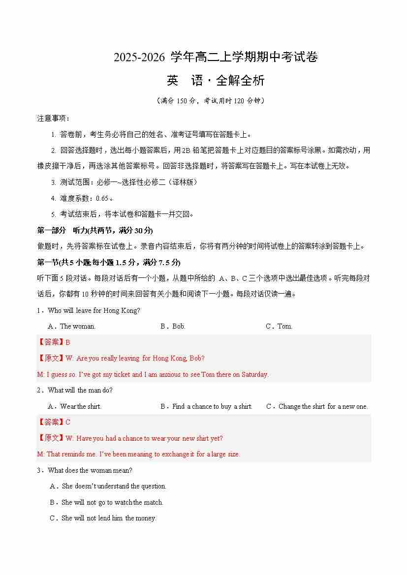 首页 > 全部 > 期中试卷 > 高二英语上学期期中考试卷(译林版·江苏专用)(教师版)
