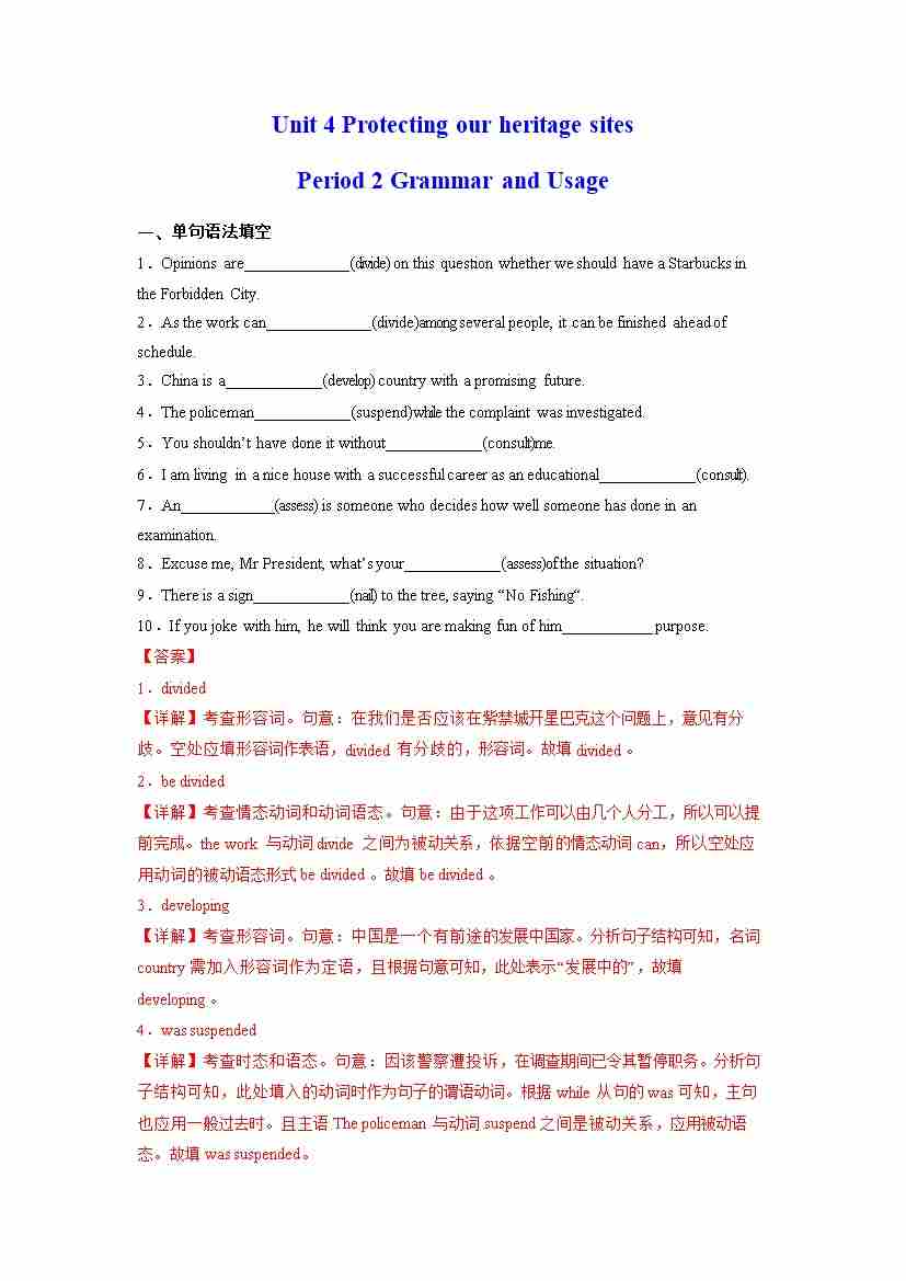 Unit 4 Protecting our heritage sites Period 2 Grammar and Usage (分层练习)(解析版)- (译林版2020选择性必修第三册)