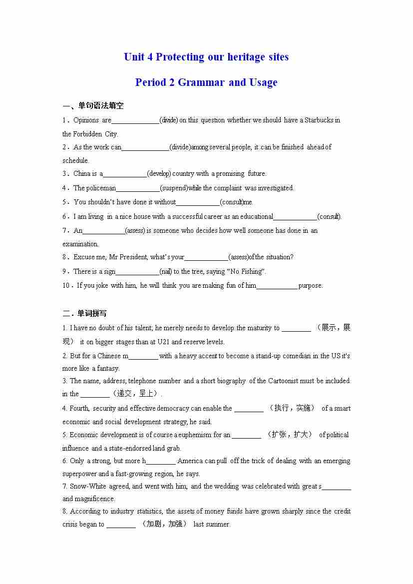 首页 > 全部 > 分层作业 > Unit 4 Protecting our heritage sites Period 2 Grammar and Usage (分层练习)(原卷版)- (译林版2020选择性必修第三册)