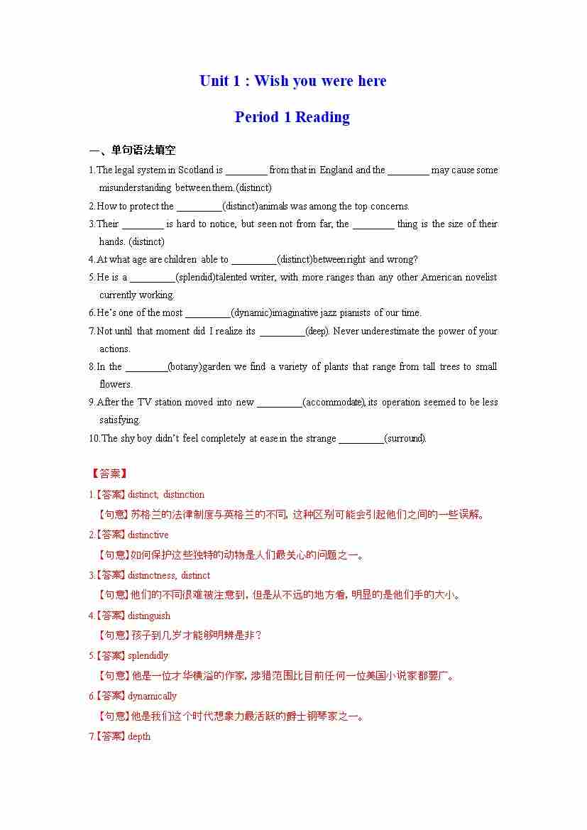 首页 > 全部 > 分层作业 > Unit 1 Wish you were here Period 1 Reading(分层练习)(解析版)- (译林版2020选择性必修第三册)