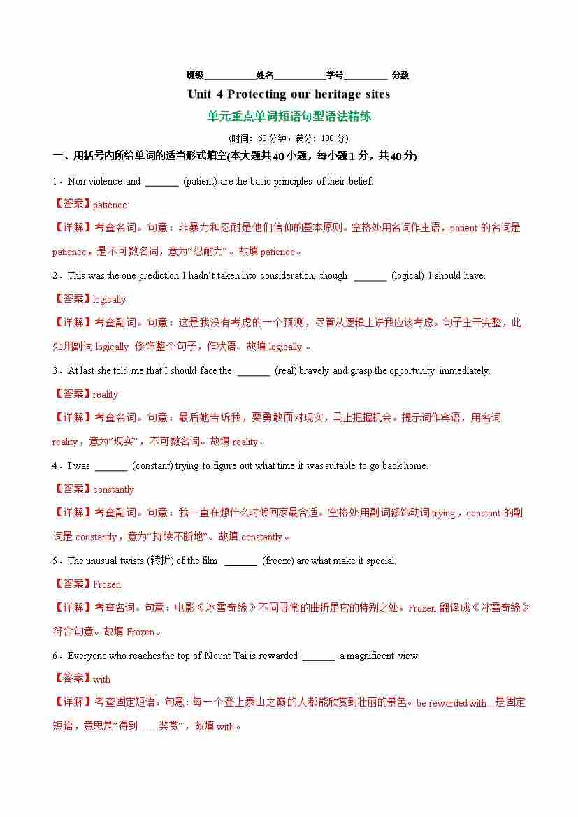 Unit 4 Protecting our heritage sites(单元卷•考点卷)(单词短语句型语法)-(教师版)