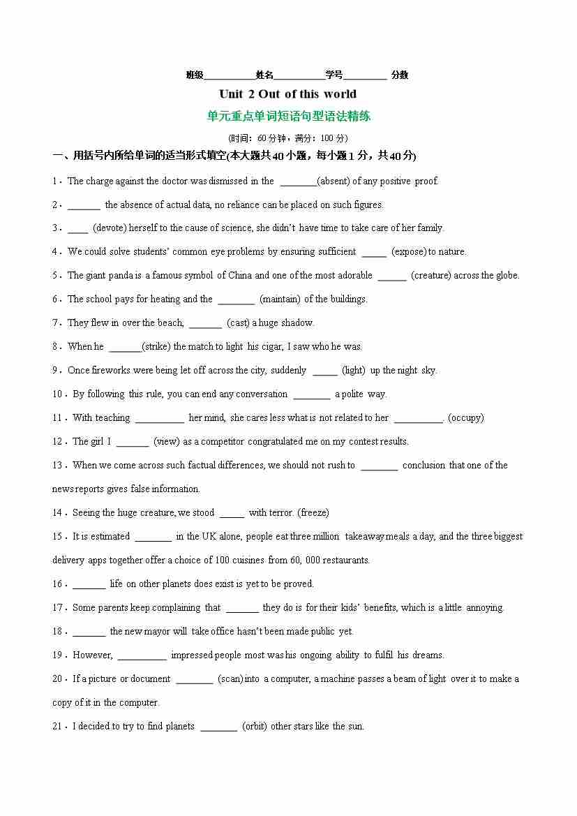 首页 > 全部 > 单元测试 > Unit 2 Out of this world (单元卷•考点卷)(单词短语句型语法)-(学生版)