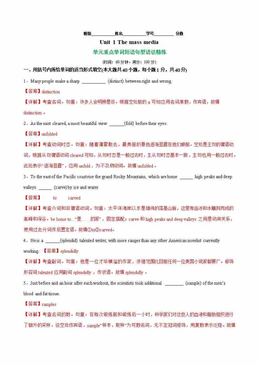 首页 > 全部 > 单元测试 > Unit 1 Wish you were here (单元卷•考点卷)(单词短语句型语法)-(教师版)