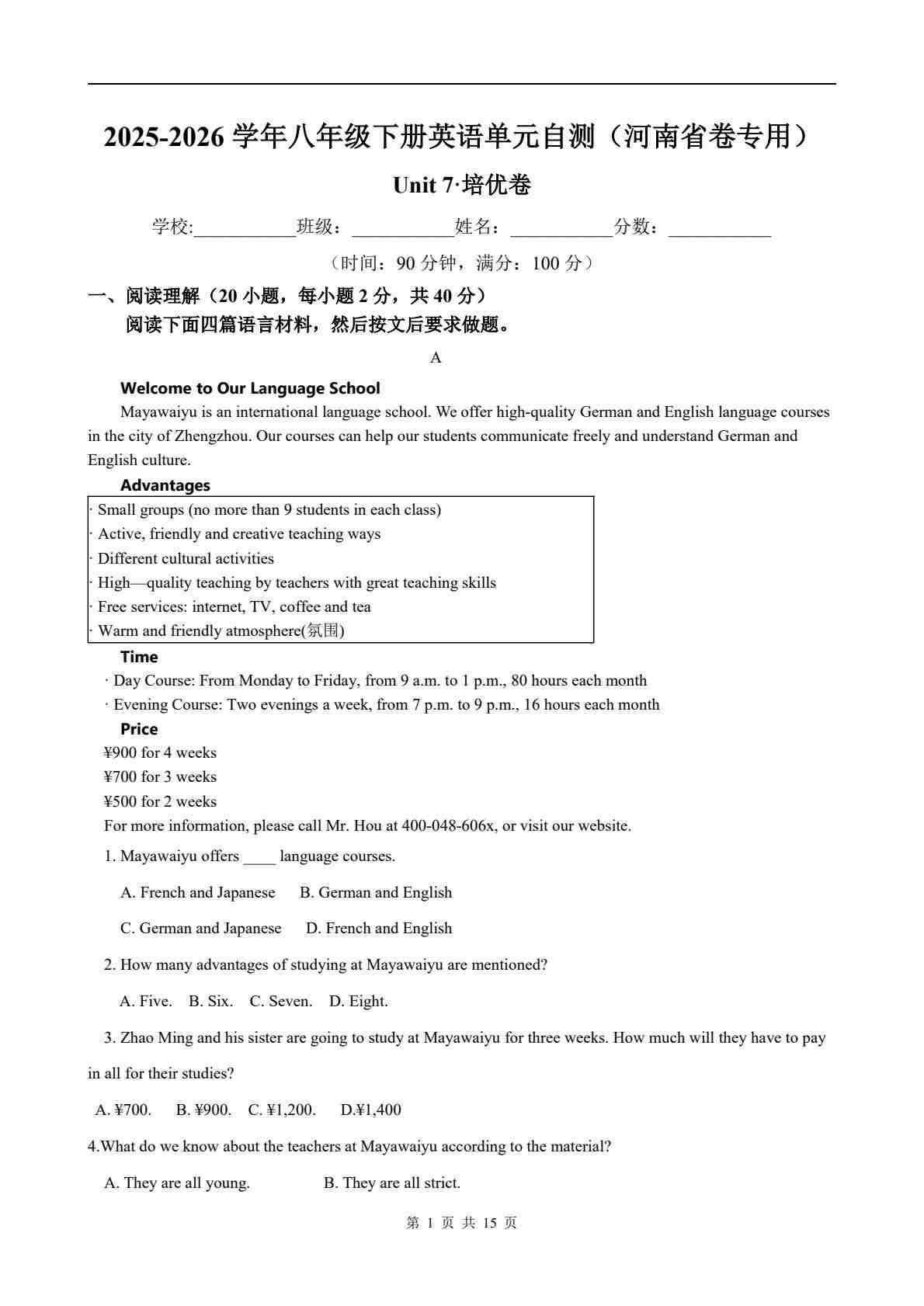 Unit 7 单元自测·河南专用(解析版)1