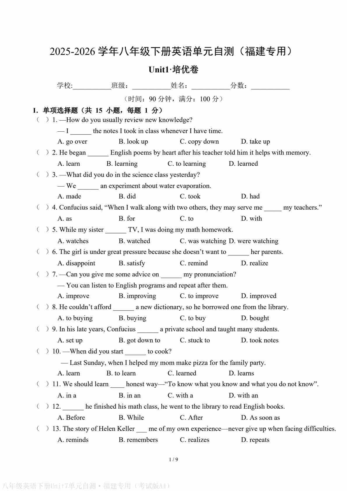 首页 > 全部 > 单元测试 > Unit7单元自测·福建专用(考试版A4)
