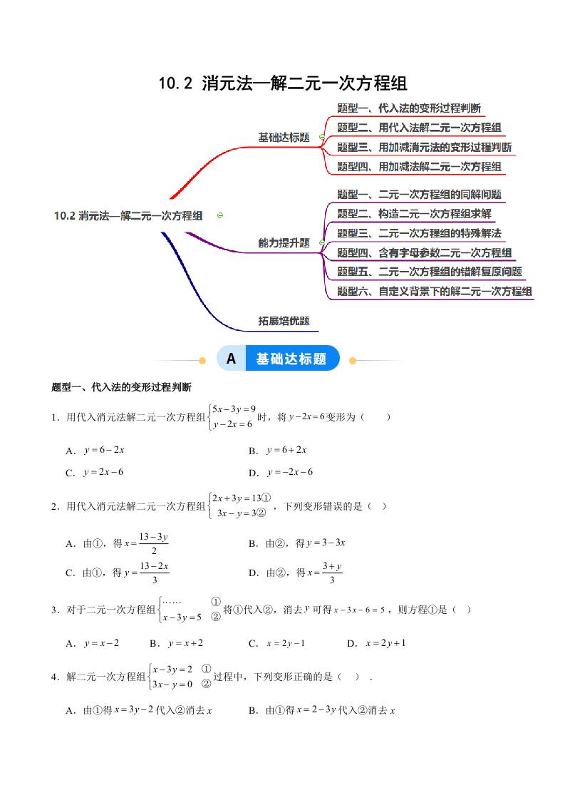 首页 > 全部 > 分层作业 > 10.2 消元法—解二元一次方程组(题型专练)(原卷版)